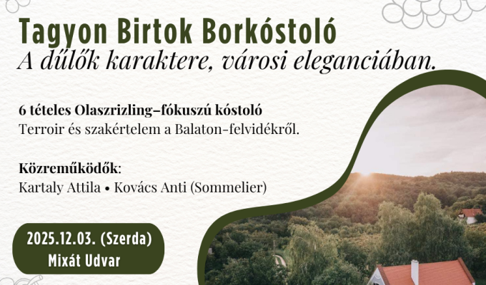Vedd meg jegyed itt: https://tagyonbirtok.hu/termek/borkostolo-jegy-mixat-udvar/